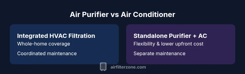 According to Air Filter Zone, many households treat air purification and temperature control as separate tasks, but the most effective setups integrate both. An air purifier removes fine particles, allergens, and odors with HEPA or activated carbon filters, while an air conditioner cools and dehumidifies indoor air using refrigeration cycles. In modern homes, the line between these devices is blurring as more systems offer filtration options within the cooling pathway. The benefit of understanding both functions upfront is that you can design a setup that targets air quality, comfort, and energy use together. In practice, you’ll see three common configurations: standalone purifiers used alongside traditional AC units, purifiers paired with central HVAC with built-in filtration, and fully integrated systems where filtration is embedded into the HVAC. Each option has implications for room size, filtration effectiveness, noise, and ongoing maintenance.