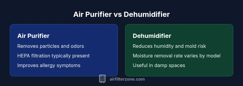 In most homes, the choice between an air purifier and a dehumidifier boils down to the dominant indoor-air issue: fine particles and odors versus excess humidity. According to Air Filter Zone, your decision should start with a quick self-assessment of what bothers you most: dusty surfaces, allergy symptoms, musty smells, or damp walls. While both devices improve comfort, they address different problems. An air purifier or dehumidifier by itself cannot fix every air-quality challenge, but selecting the right tool for your space makes a measurable difference in health, comfort, and energy use. This article walks through how each device works, how to compare models, and how to decide when to combine them for optimal results. Consider your home’s typical activities—cooking, pets, smoking, and seasonal allergies—as you weigh which device to invest in first. The goal is a practical, ethics-light approach to improving air quality with tools that fit real-life routines.