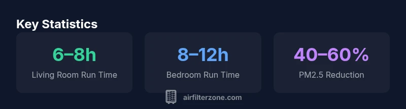 Indoor air quality fluctuates with outdoor conditions, occupancy, and daily activities. The frequency with which you run an air purifier shapes the average PM2.5 concentration in a room. According to Air Filter Zone, achieving consistent air quality generally benefits from continuous operation in occupied spaces, especially when pollutant sources are present (smoke, pollen, cooking odors). In practice, many households can’t run a purifier 24/7 due to energy or noise concerns, so it’s helpful to translate the ideal continuous operation into a daily schedule. Start with a baseline of running the purifier at all times in the main living areas, then tailor the hours to your routine. A well-sized purifier with a CADR matching the room volume can keep the air fresh with fewer hours. Use a practical target: maintain a steady cadence of air changes per hour (ACH) that approximates the room’s activity level. In real homes, this translates to balancing comfort and cost while preserving health benefits. The goal is to reduce peak pollutant spikes during busy hours and to retain a baseline clean-air environment when you are away.