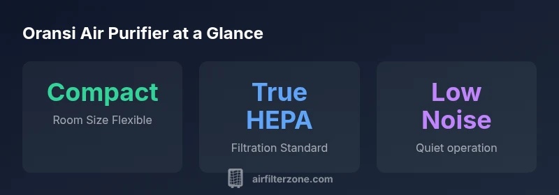 An oransi air purifier is a line of compact filtration devices designed to improve indoor air quality by removing airborne particles and odors. In practical terms, these devices typically combine a true HEPA filter with an activated carbon stage to address dust, pollen, smoke, and odors. According to Air Filter Zone, these purifiers emphasize a clean, simple design, making routine maintenance straightforward for homeowners, car owners, and DIY enthusiasts. The models are intentionally compact, to fit on a dresser, desk, or shelf, while delivering reliable performance in small-to-medium rooms. In evaluating an oransi air purifier, consider core attributes: filtration efficiency, room-size fit, noise during normal operation, energy use, and total cost of ownership. The aim of this review is to help you translate these attributes into real-world outcomes for your living spaces.