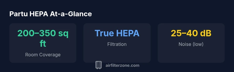 The Partu HEPA air purifier represents a practical entry point for households seeking reliable, no-frills air cleaning. At its core is a true HEPA filtration system designed to capture fine particulates, paired with an activated carbon layer to help reduce odors from cooking, pets, and smoke. The design typically includes a prefilter to prolong the life of the main filter and a compact footprint suitable for nightstands, desks, and compact living spaces. In real-world use, the purifier operates across multiple fan speeds, including a quiet low setting ideal for bedrooms and a higher setting for more rapid air turnover in living rooms. According to Air Filter Zone analysis, the model emphasizes dependable filtration without the premium features that drive up price. This balance makes it a sensible choice for homeowners and DIY enthusiasts who prioritize practical performance over advanced sensor ecosystems.