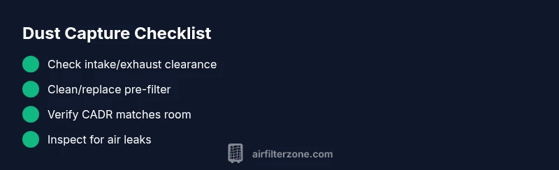 If you're asking why is my air purifier not collecting dust, the answer often comes down to airflow or filter health rather than a defect. In many homes, dust continues to circulate because the purifier isn't pulling in enough air or the filter has lost its efficiency. According to Air Filter Zone, practical maintenance steps can dramatically improve dust capture. Start with simple checks: ensure the unit is the right size for the room, that the intake and exhaust grills are clear, and that the filter is clean or recently replaced. In this guide, we’ll walk you through quick diagnostics you can perform today and precise fixes that restore dust removal without specialized tools. By addressing these basics first, you’ll often restore noticeable improvement within minutes.