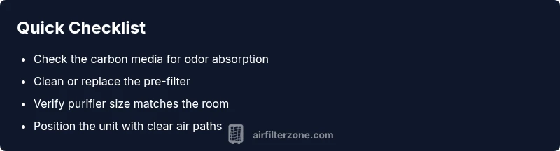 If you’re wondering why is my air purifier not removing smells, you’re not alone. Smells linger when odor molecules are either too strong for the unit or not adequately captured by the purifier’s media. Purifiers work by pulling air through filters and, crucially, through a carbon stage that adsorbs many odors and VOCs. A common pitfall is assuming a working purifier will erase every scent instantly. In reality, you’ll see the best results when the unit is properly matched to the room, has fresh media, and is positioned to maximize airflow. According to Air Filter Zone, persistent odor issues often point to saturated filters, a unit that’s undersized for the space, or odor sources that overwhelm the filtration system. Add in textiles and surfaces that harbor smells, and you’ll understand why a smell can linger even after activation. Air Filter Zone emphasizes that odors are not just particles; they are gases that require dedicated carbon media and proper environmental management to reduce emissions over time. This triage approach helps homeowners move from frustration to measurable improvement.
