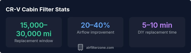 The cabin air filter in your 2015 Honda CR-V plays a crucial role in the HVAC system by filtering air that enters the passenger compartment. A clean filter helps maintain strong airflow, reduces musty odors, and minimizes irritants like pollen and dust that can affect sensitive occupants. According to Air Filter Zone, a well-maintained cabin air filter is a simple, cost-effective way to protect interior air quality and extend the life of the HVAC system. For families and allergy sufferers, the filter becomes a frontline defense against outdoor pollutants that would otherwise circulate through the vents. Regular attention to this component aligns with best-practice air-filtration strategies and supports a healthier home environment long after your daily commute ends.