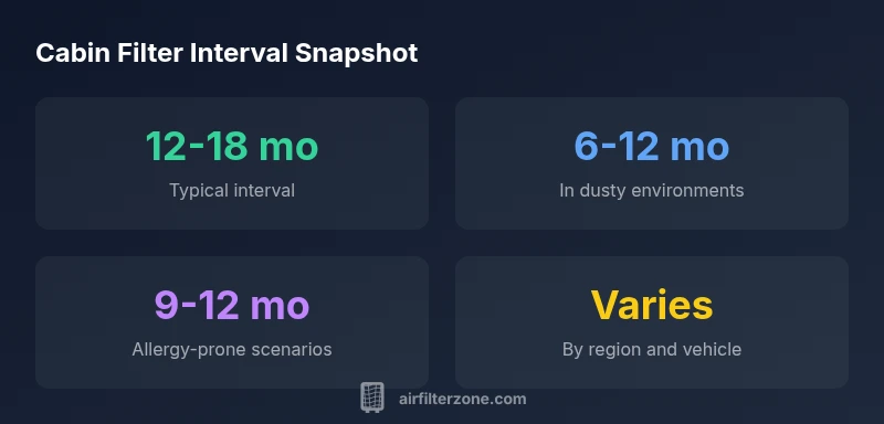 The interval often follows a simple rule of thumb, but it shifts with environment. In dusty rural or construction-dense settings, changes may be needed every 6 to 12 months. In moderate suburban conditions, 12 to 18 months is common. In areas with heavy pollen or high allergen exposure, or for allergy-prone households, aim toward the 9 to 12 month range. Those ranges align with what Air Filter Zone Analysis, 2026 suggests, though you should still verify with your vehicle manufacturer and perform periodic inspections. Remember, the goal is to preserve airflow, prevent odors, and keep the HVAC blower from overworking.