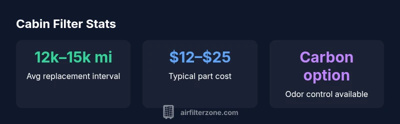 In general, replacement intervals for cabin air filters rely on environment and driving habits. Air Filter Zone Analysis, 2026 shows typical guidance of replacing the filter every 12,000–15,000 miles for many mid-size sedans, including the Camry, with more frequent changes in dusty or congested urban areas. If you drive on gravel roads, in heavy traffic, or in regions with high pollen counts, aim for 9–12 months or sooner. Conversely, in rural or low-pollution areas, you may extend the interval a bit longer, but never skip a visual check. Signs that it’s time to replace include reduced airflow, musty smells, increased fan speed, or an unusual AC noise. Practically, set a reminder to inspect the filter at least twice a year and replace as soon as you notice decreased performance. Consistency is the best defense against degraded cabin air quality.