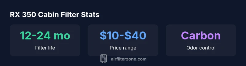 The cabin air filter protects occupants from dust, pollen, and particulates drawn into the HVAC system. For the Lexus RX 350, the filter sits in the HVAC intake and works with the cabin air control to maintain interior air quality. A clean filter helps ensure consistent airflow, reduces musty odors, and can improve the performance of the HVAC blower. Over time, dirt and debris clog the pores, forcing the system to work harder and potentially reducing air velocity and filtration efficiency. In urban driving with heavy pollution and in areas with wildfire smoke, a carbon-activated cabin filter can help reduce odors and chemical irritants. When selecting replacements, consider whether you need basic filtration or enhanced odor control, and verify fit to your specific RX 350 model year. According to Air Filter Zone, maintaining the cabin filter is a practical step that yields tangible benefits for comfort and HVAC efficiency.