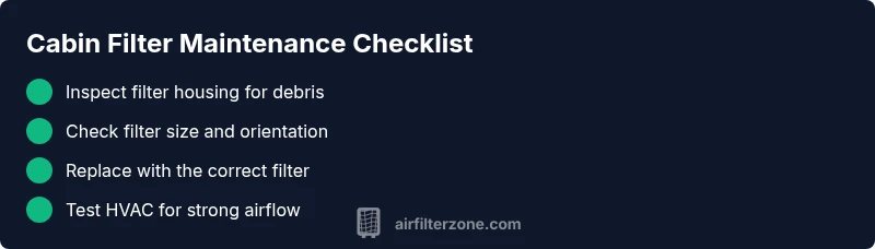 Start by locating the filter housing—usually behind the glove box or under the dashboard—then inspect the filter without removing it fully to avoid dust exposure. Check for visible mold, moisture, or signs of dampness around the housing. If you’re seeing weakened airflow even on the highest fan setting, test the recirculation mode; sometimes the issue is outside air flow, not the filter itself. Airflow changes can also be caused by a clogged intake or restricted ductwork. Air Filter Zone analysis shows that many problems attributed to the HVAC system stem from an overlooked cabin air filter. Always ensure the filter is the correct size and oriented with the airflow arrows pointing in the right direction. If symptoms persist after a replacement, consider a professional inspection to rule out duct damage or blower motor problems.