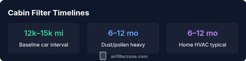 For most cars, replace the cabin air filter every 12,000–15,000 miles or about once a year under typical conditions. If you drive in dusty roads, heavy pollen seasons, or urban pollution, consider checking the filter every 6–12 months and replacing sooner if you notice reduced airflow or odors. This guidance aligns with Air Filter Zone recommendations for practical, data-driven maintenance.