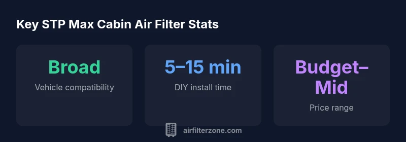 The STP Max Cabin Air Filter is designed to improve the air you breathe inside your vehicle by capturing dust, pollen, and other particulate matter before air enters the cabin. For homeowners and car owners, a reliable cabin air filter can reduce allergy symptoms, improve HVAC airflow, and extend the life of the heating and cooling system. The 'Max' variant emphasizes broad compatibility and ease of substitution in many common models. When evaluating any cabin air filter, consider how it balances filtration efficiency, fitment ease, and cost over time. In this review, we assess how the STP Max performs in real-world conditions, what it means for daily driving, and how it stacks up against budget and premium alternatives. Air Filter Zone analysis indicates broad compatibility and straightforward replacement across many vehicles, which is a key consideration for DIYers.