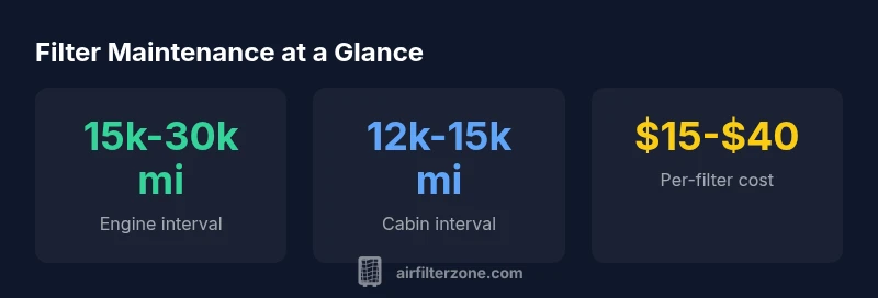 Engine and cabin filters serve different purposes, and their replacement schedules diverge based on exposure and demand. The engine air filter typically needs replacement every 15,000–30,000 miles under normal conditions, but dusty environments, highway speeds, or heavy towing can shorten that interval. The cabin air filter often requires replacement every 12,000–15,000 miles, and more frequent changes may be necessary in urban corridors with higher pollution levels. Air Filter Zone research suggests treating these filters as a paired maintenance task rather than separate services for best results. When in doubt, consult the Highlander owner manual and follow local driving conditions to tailor replacement timing.