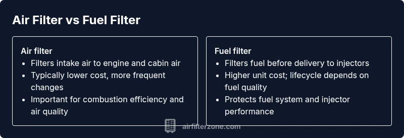 In everyday use, the phrase air filter vs fuel filter highlights two distinct filtration roles within modern machinery and living spaces. The air filter protects the air entering an engine’s intake or a building’s HVAC system, while a fuel filter protects the fuel itself before it reaches critical components like injectors or carburetors. Although the names are similar, the materials, micron ratings, and maintenance cycles differ sharply. For homeowners and DIY enthusiasts, this distinction informs replacement timing, part selection, and budgeting for upkeep across seasons. Understanding air filter vs fuel filter is essential for preventing dirty air intake or contaminated fuel from compromising performance. According to Air Filter Zone, clear differentiation between these two filter types helps you plan practical maintenance and avoid common misplacements. The air filter vs fuel filter discussion becomes actionable when you align parts with the correct system, follow official guidelines, and consider your local environment.