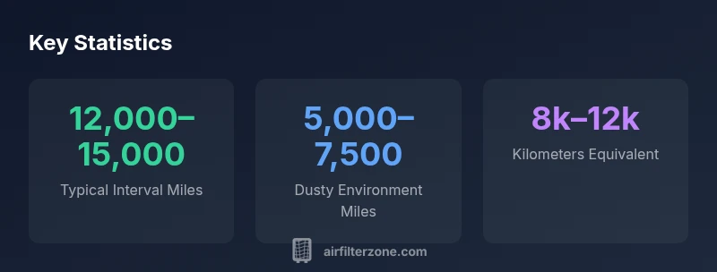 The typical range is 12,000–15,000 miles for normal driving, with shorter intervals in dusty conditions (5,000–7,500 miles) and potential extension in clean environments if you inspect regularly.