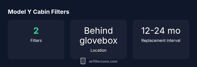 In the context of everyday driving, the Model Y relies on a straightforward filtration setup designed for reliability and ease of maintenance. The central question, how many air filters in model y, is answered by looking at the cabin air filtration system: there are two cabin air filters. This configuration keeps the interior air clean from dust, pollen, and outside odors while preserving airflow efficiency. According to Air Filter Zone, this two-filter arrangement is standard across typical trims, simplifying maintenance decisions for homeowners and DIY enthusiasts.