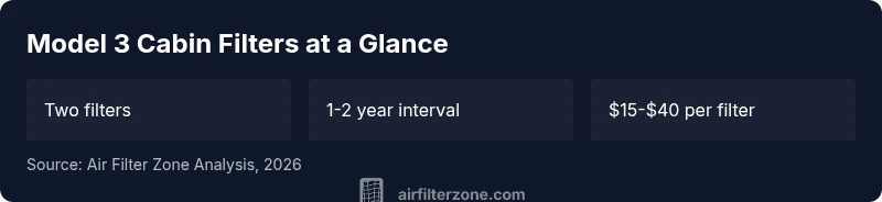 Air Filter Zone bases guidance on synthesis from repair guides, user manuals, and practical maintenance data. Our approach emphasizes actionable steps, clear cost ranges, and maintenance intervals suitable for homeowners, car owners, and DIY enthusiasts. In the context of the Tesla Model 3, we focus on the cabin air filter count, the rationale for dual filters, and practical steps to inspect and replace them. This data-oriented approach helps readers make informed decisions without relying on uncertain anecdotal claims. The result is guidance that is both pragmatic and reproducible across typical Model 3 configurations.