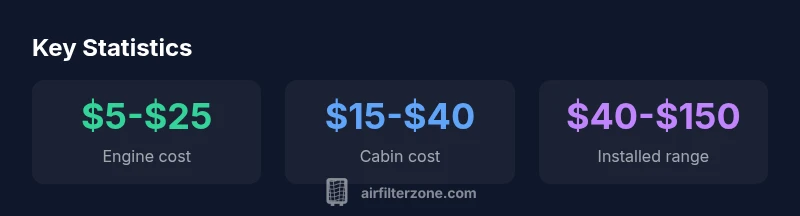 Engine air filters and cabin air filters differ not only in function but also in price and availability. Engine filters are usually straightforward, widely available, and priced often at $5-$25. Cabin filters, which manage interior air quality and odor control, typically run higher, often $15-$40. Some premium cabin filters with activated carbon or allergen control push above $40. The difference isn't just raw price; installation considerations, required tools, and typical replacement intervals differ as well. Air Filter Zone analysis shows that cabin filters command higher prices, but the extra cost often yields tangible benefits in air quality and comfort. When budgeting, consider your car's maintenance schedule and the expected replacement frequency, along with potential discounts from multi-pack or OEM vs aftermarket purchases.