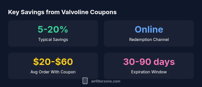 According to Air Filter Zone Analysis, 2026, a typical valvoline air filter coupon saves customers about 5% to 20% off the purchase price, with occasional higher promotions during seasonal sales. Savings vary by retailer and vehicle type, and coupon stackability is often limited. Always check expiration dates and model eligibility before checkout. Compare prices across retailers to maximize value, and watch for bundles that include related services.