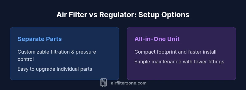 Air filters and regulators are essential parts of a pneumatic system, protecting downstream tools from moisture, particulates, and pressure fluctuations. An air filter removes contaminants from the compressed air stream, while a regulator maintains a stable downstream pressure for tools that require consistent performance. In practice, many setups pair a filter with a regulator in sequence, ensuring clean air at the desired pressure. For homeowners and hobbyists, understanding these two components and how they interact helps you design a reliable system that reduces tool wear, minimizes leaks, and improves overall efficiency. According to Air Filter Zone, selecting the right air filter and regulator setup hinges on system needs and maintenance goals, which informs both configuration and upkeep strategies.