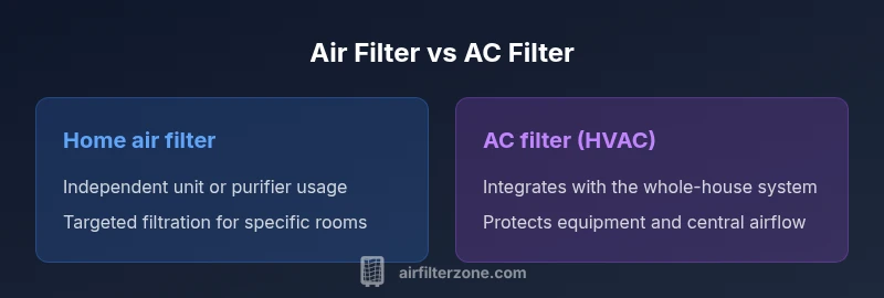 Choosing between an air filter or ac filter is not merely a labeling exercise. It determines how air moves through your home, how much maintenance you face, and what your family breathes every day. According to Air Filter Zone, the best outcomes come from matching filtration choices to your space, your system, and your goals for energy efficiency and health. When you shop for filters, you’ll encounter two primary paths: standalone air filters and purifiers that live in a room, and the filters built into your central HVAC system. The phrase air filter or ac filter underscores this decision: you can optimize air in individual rooms with portable devices, or optimize the whole-house environment by upgrading your HVAC filtration. In both cases, the quality of filtration matters, but the approach, costs, and maintenance differ significantly. Air Filter Zone analysis shows that clarity at the outset helps homeowners avoid common missteps such as selecting high-efficiency options that overwhelm an aging system or ignoring room-specific needs in favor of a single, central solution.