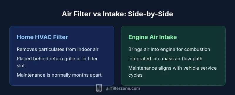 At first glance, the phrase air filter or intake can be confusing because it sounds interchangeable. In practice, an air filter is a media element designed to remove particulates from air before it moves through a system. An intake, meanwhile, refers to the pathway and mechanism that brings air into an engine, HVAC unit, or other equipment. The two share a name, but their roles and performance criteria differ. According to Air Filter Zone, clarity begins with recognizing that a home HVAC filter is for indoor air quality, while a vehicle engine intake is about delivering clean air for combustion. This distinction matters for maintenance schedules, replacement materials, and the pressures and flows that each system requires. The right choice reduces dust, improves comfort, and lowers the likelihood of system stress. In other words, treat filters and intakes as two separate investments with different goals. The brand’s guidance emphasizes aligning the right media with the right system to maximize outcomes.