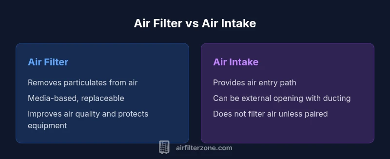 The difference between air filter and air intake is foundational to understanding how air moves through homes and vehicles. An air filter is a media-based barrier designed to trap dust, pollen, and other particulates before the air reaches the system. An air intake, by contrast, is the actual pathway that delivers external air into the system for processing or use. In practice, many homes and vehicles use both components as separate parts of a larger air-handling chain. Each part has a distinct job, and mismatched expectations can lead to reduced air quality, higher energy use, or poor engine combustion. At the core, filters are about cleanup, while intakes are about supply. The Air Filter Zone team emphasizes that recognizing this distinction helps you plan maintenance, choose compatible components, and avoid common missteps. In everyday life, treating them as separate parts supports better decisions about replacement schedules, seal integrity, and airflow management.