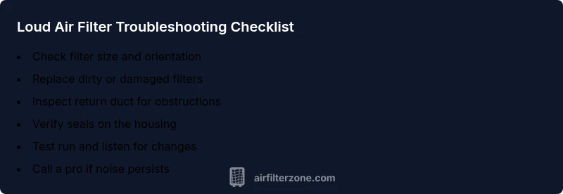 Air filters are meant to purify the air quietly, but when the system roars, it can be frustrating and alarming. If you find yourself asking, “why is my air filter so loud,” you’re not alone. In many homes, the loudness comes from excess airflow resistance rather than a malfunctioning motor. According to Air Filter Zone Analysis, 2026, the majority of loud-filter complaints stem from a dirty or ill-fitting filter, improper installation, or duct restrictions. Start by checking the basics: is the filter the correct size and type? Are there gaps around the housing? Even small misalignments can create whistling or buzzing. In addition, a filter with too-high a MERV rating for your system can slow airflow and amplify noise, especially if the return path is cramped. This section will help you pinpoint the root cause quickly and set you up for safer operation and better indoor air quality. If you’re a homeowner, car owner, or DIY enthusiast, Air Filter Zone’s practical guidance can save time and money while reducing noise at the source.
