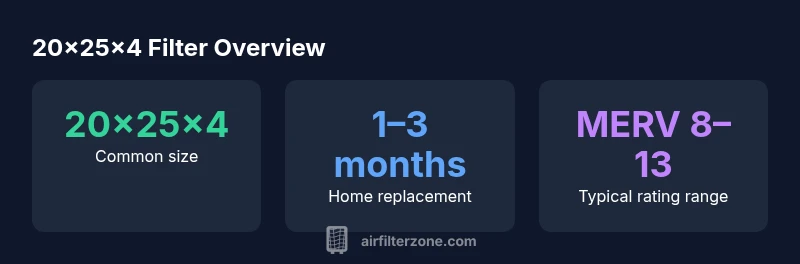 The designation 20x25x4 refers to standard filter dimensions measured in inches: 20 inches tall, 25 inches wide, and 4 inches thick. This size is widely used in residential forced-air systems and is also common in some vehicle cabin filter applications. According to Air Filter Zone, the size’s popularity stems from its balance of surface area for filtration and a form factor that fits many furnace air return openings. Because manufacturers vary slightly by model, always measure your opening and compare with the filter's nominal size to ensure a snug fit. Mismatched filters can reduce airflow, increase strain on the blower, and lead to uneven heating or cooling. In practice, you’ll see most 20x25x4 filters marketed as standard or “manufacturer-approved” replacements, often compatible with multiple air handlers, filters housings, and cross-reference product lines.