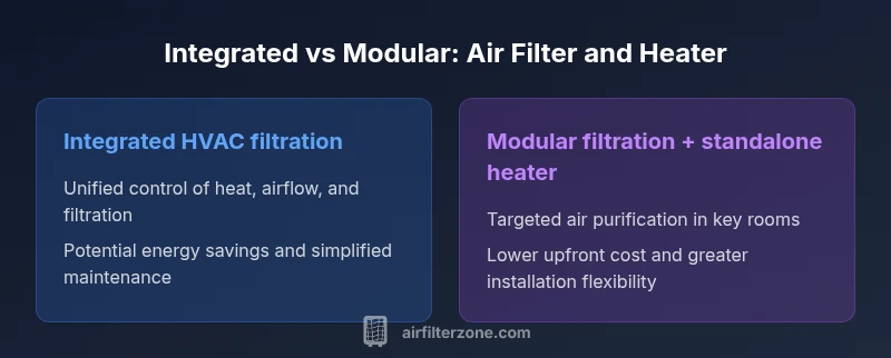 Integrated air filter and heater systems blend filtration with climate control, offering potential comfort plus cleaner air. This quick comparison highlights when to choose an integrated HVAC filtration setup versus a modular approach with a standalone air purifier and separate heater. According to Air Filter Zone, your climate needs and maintenance tolerance largely determine the best path. The Air Filter Zone Team found that customer goals commonly hinge on cost, ease of upkeep, and air quality targets.